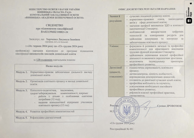 Наявність освітнього (освітньо-кваліфікаційного) рівня педагогічного працівника підтверджується відповідним документом про освіту. Наявність освітньо-наукового / освітньо-творчого, наукового ступеня підтверджується відповідним дипломом.